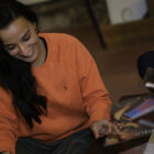 Sweat orange brûlé unisexe col rond parfait pour les saisons douces.
